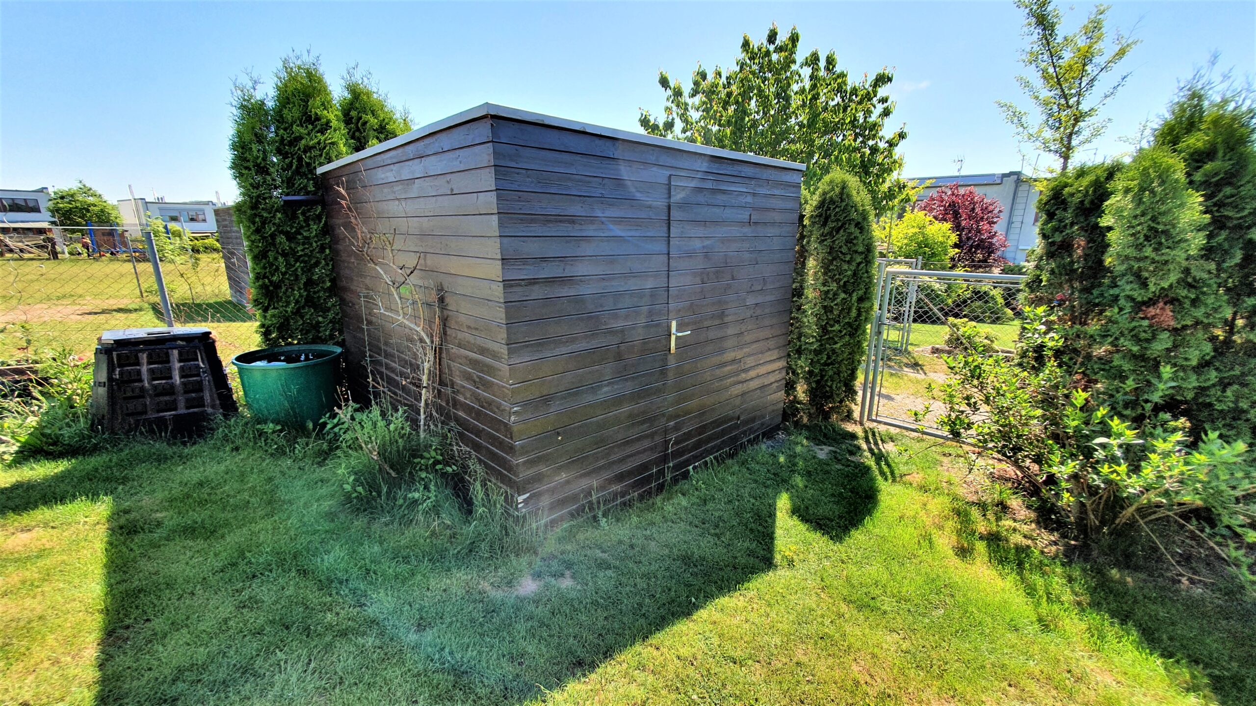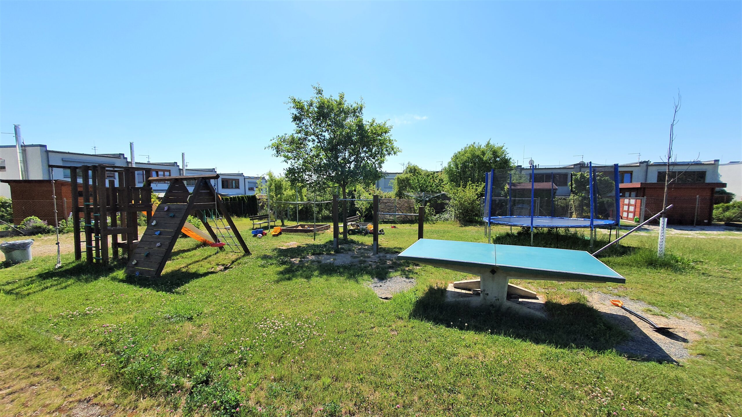 Každá rodina jistě také ocení přístup na uzavřené společné hřiště ve vnitrobloku řadových domů vybavené hracími prvky pro menší i větší děti a také možnost obslužnosti zahrady autem díky příjezdové cestě.