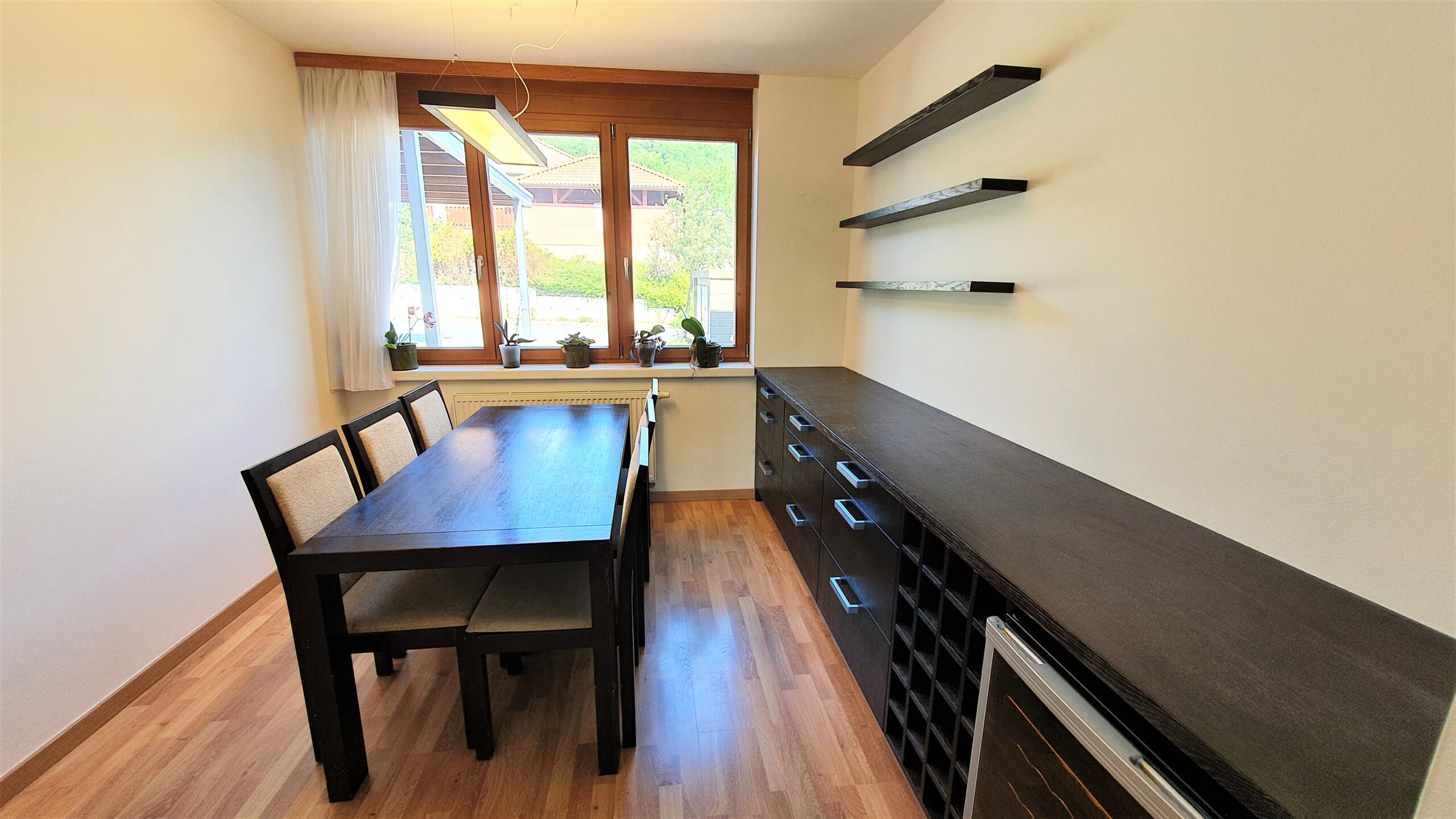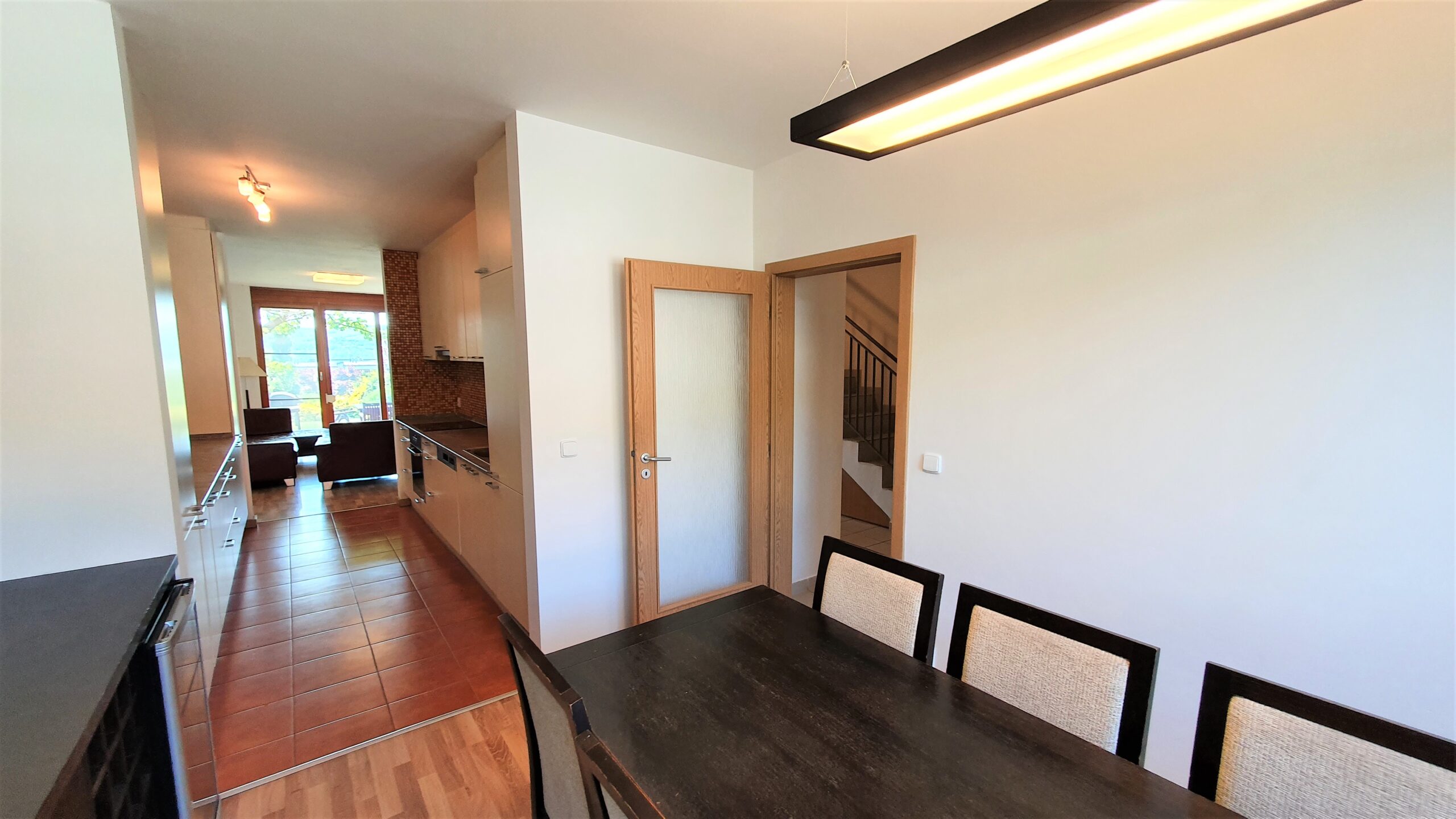 Obrovskou devizou je možnost okamžitého nastěhování bez nutnosti větších investic do vybavení, neboť dům je kompletně vybavený nábytkem včetně dětských pokojů a moderními spotřebiči v kuchyňském koutě (el. sklo-keramická deska, trouba s grilem, digestoř, lednice s mrazákem, myčka, mikrovlnná trouba).
