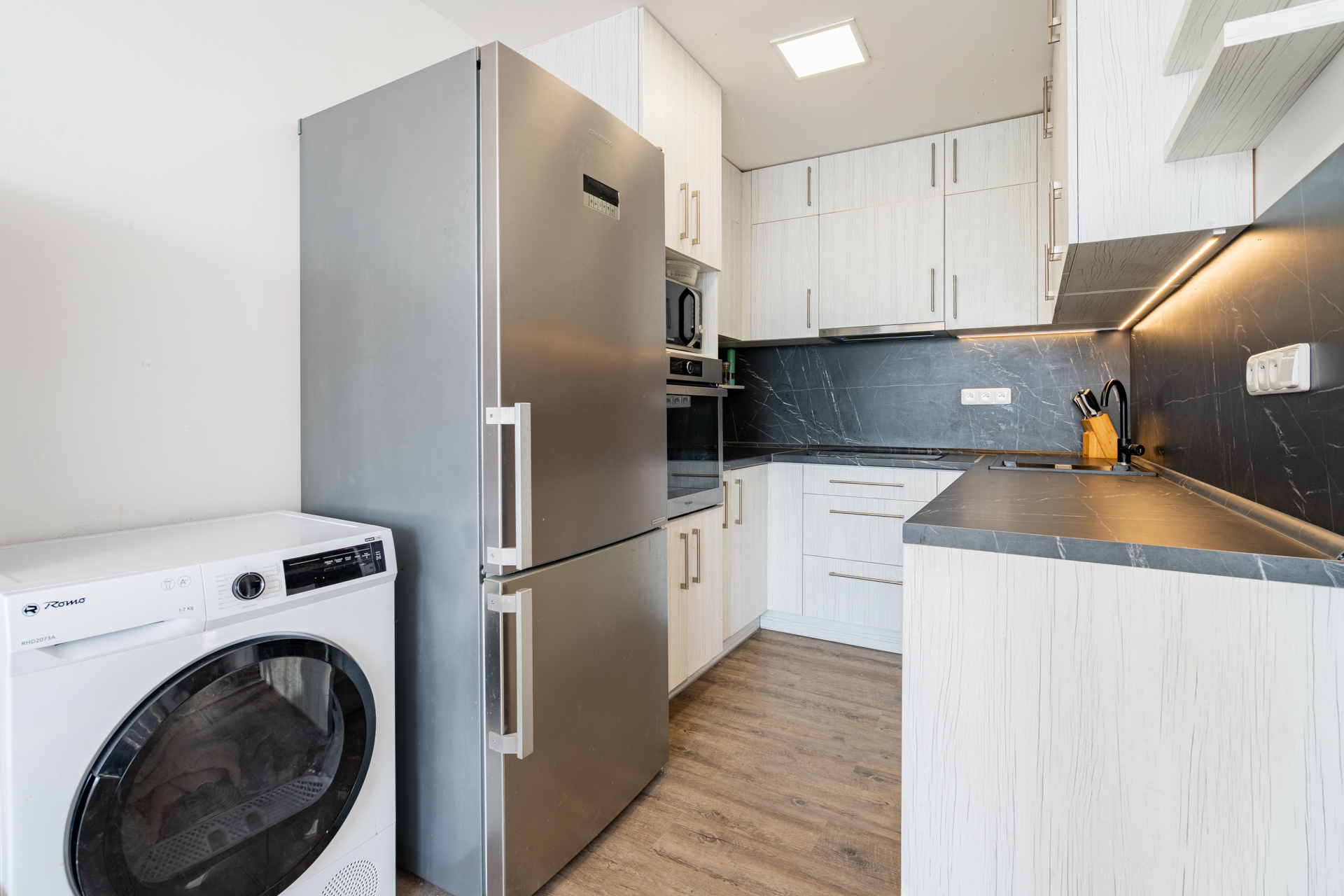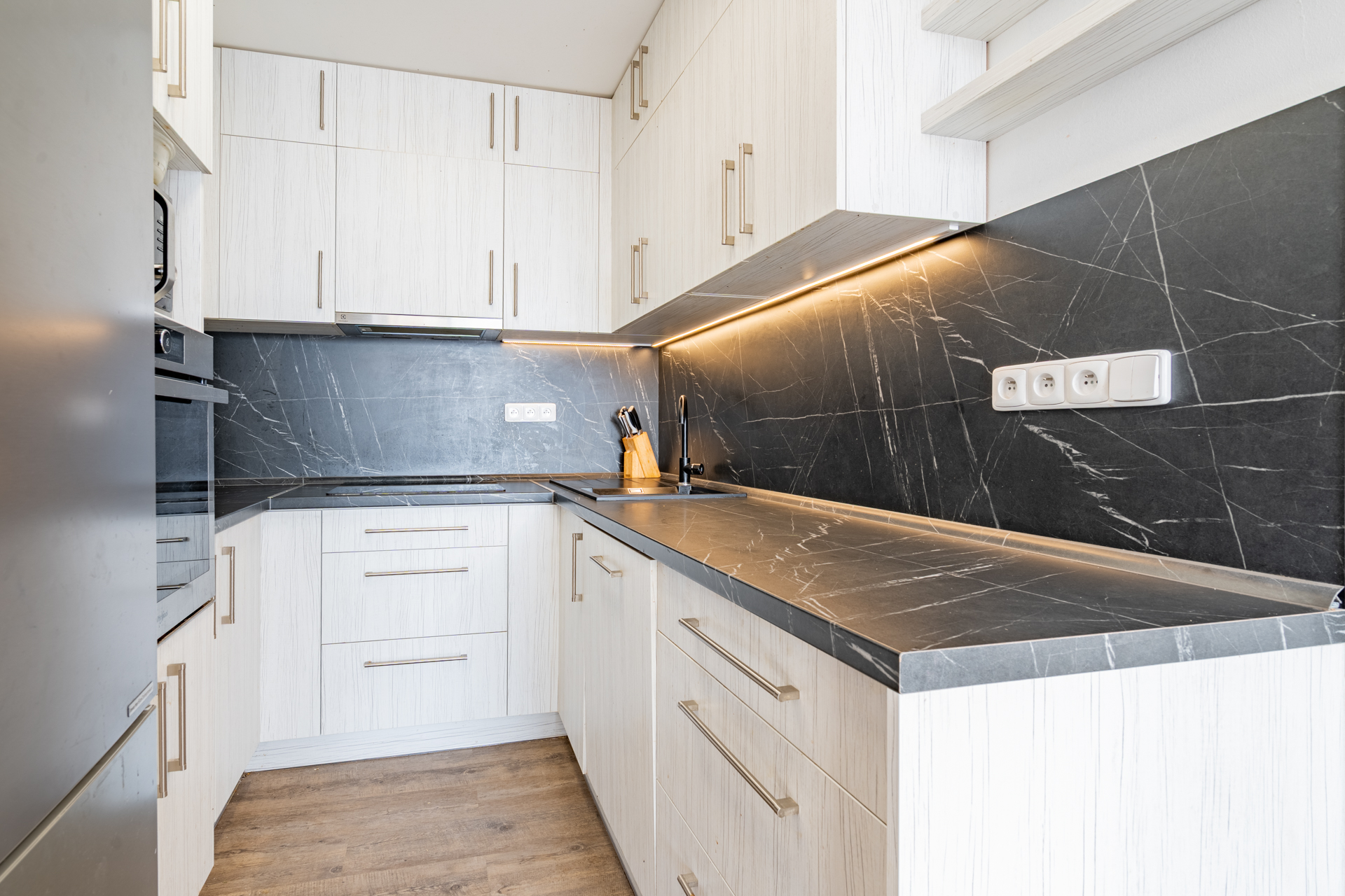 ✔ moderní kuchyň vč. kvalitních spotřebičů (indukční deska, el.trouba, myčka, lednice)