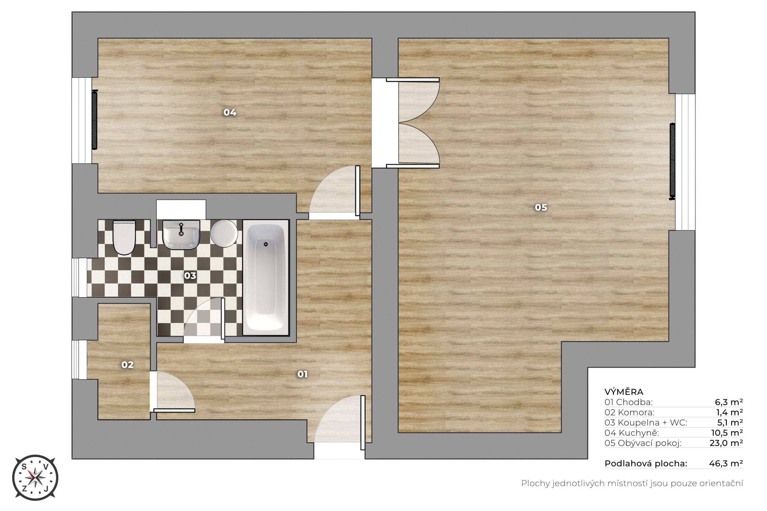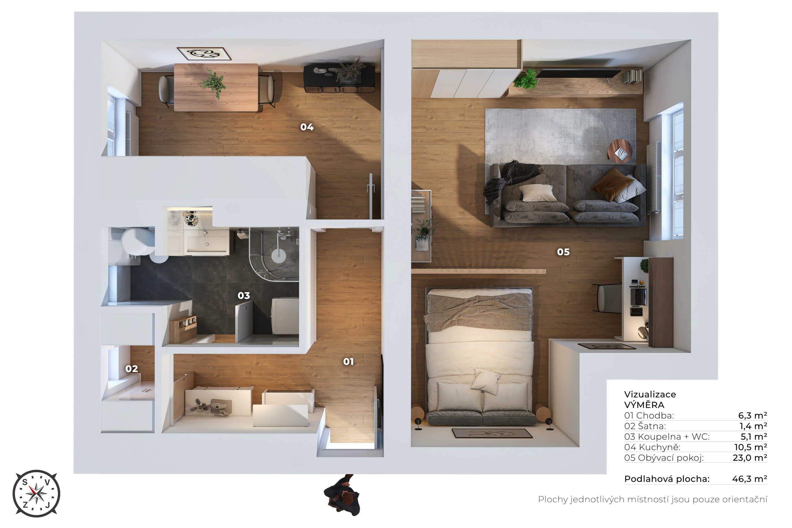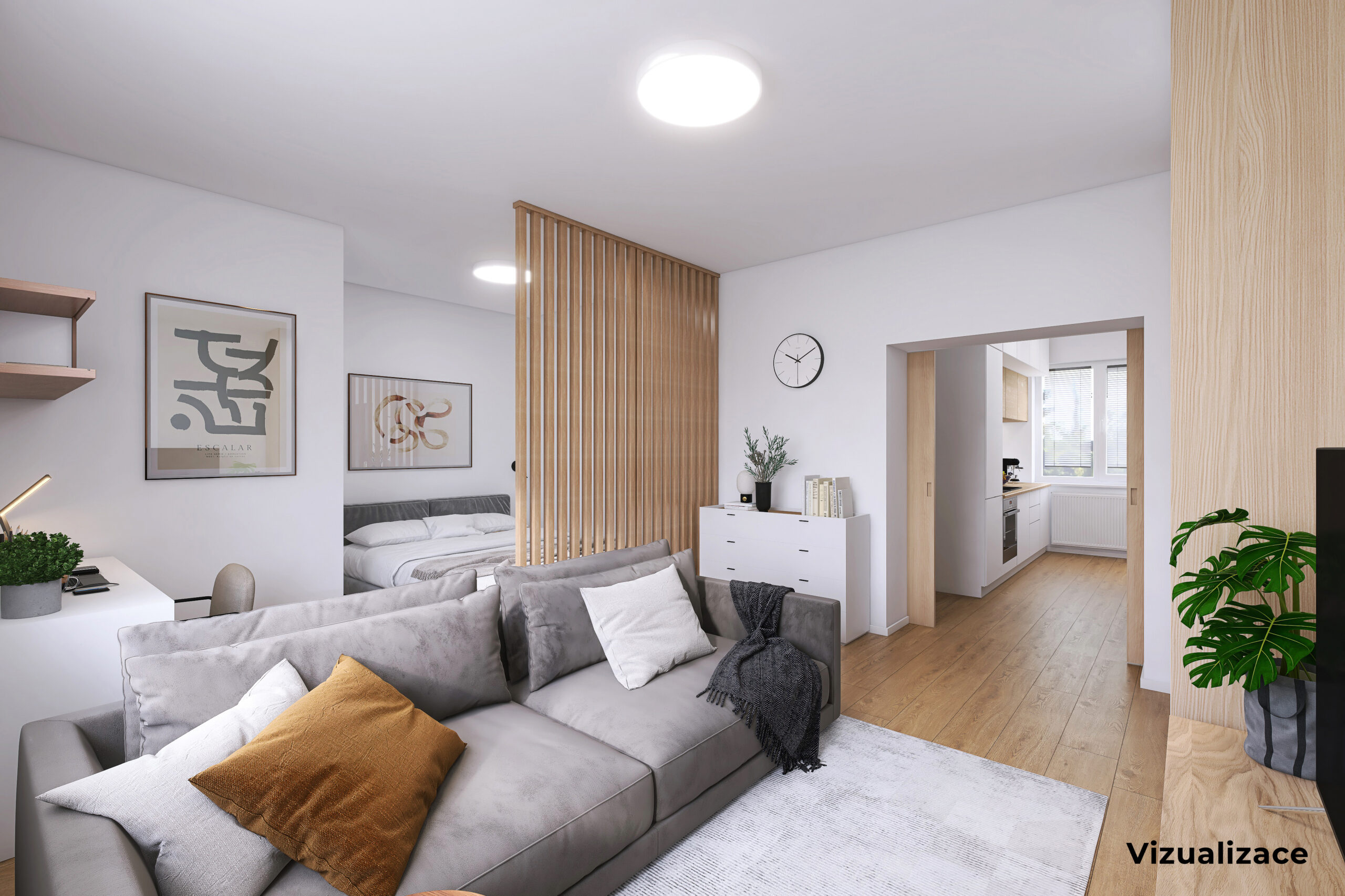Pokud máte raději bydlení podle svých představ, tento byt současně nabízí maximální prostor pro úpravy a modernizaci. Můžete se nechat inspirovat vizualizací interiéru v nabídce a získáte tak ideální návod jak využít tento velkorysý obytný prostor pro praktické bydlení.