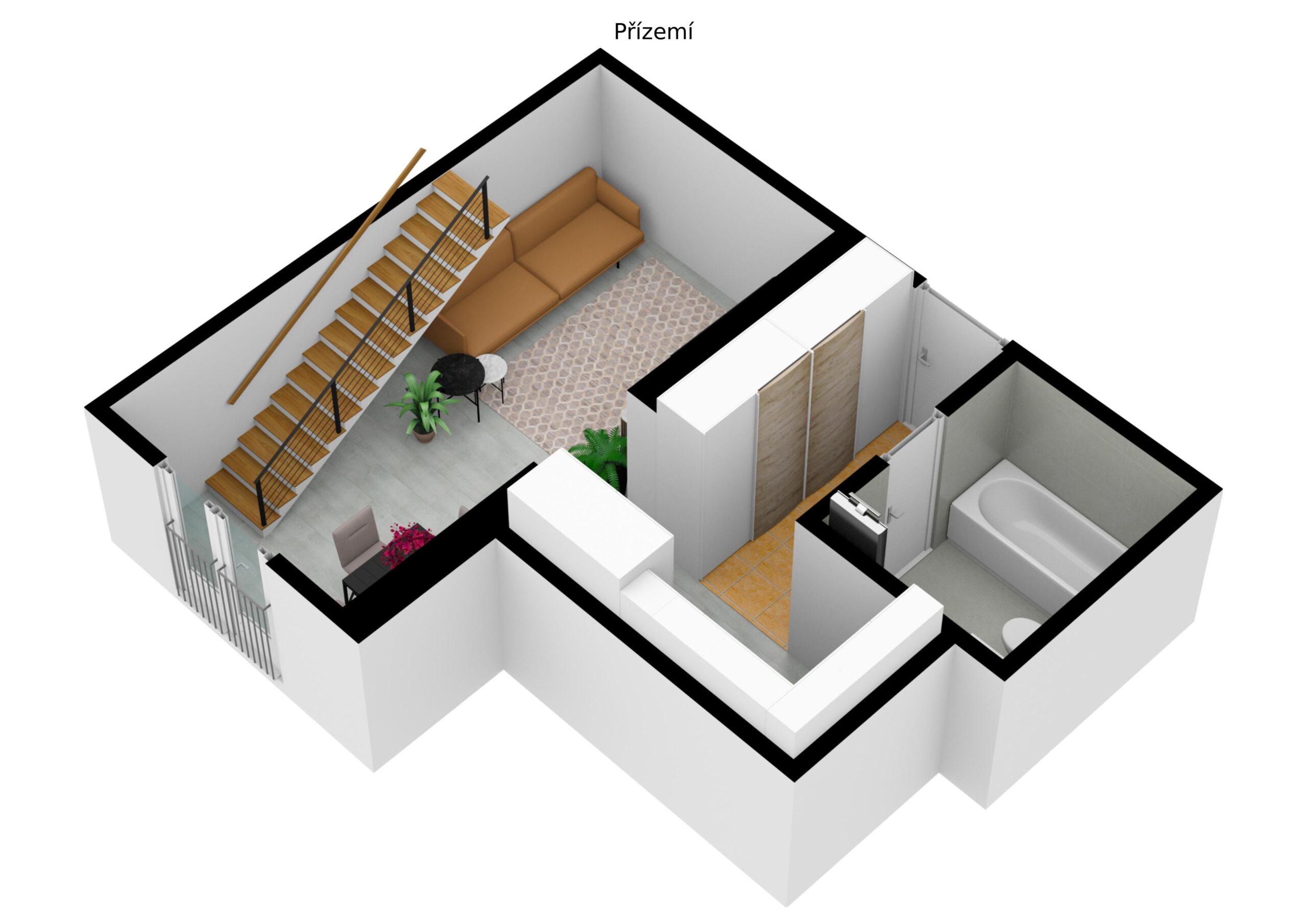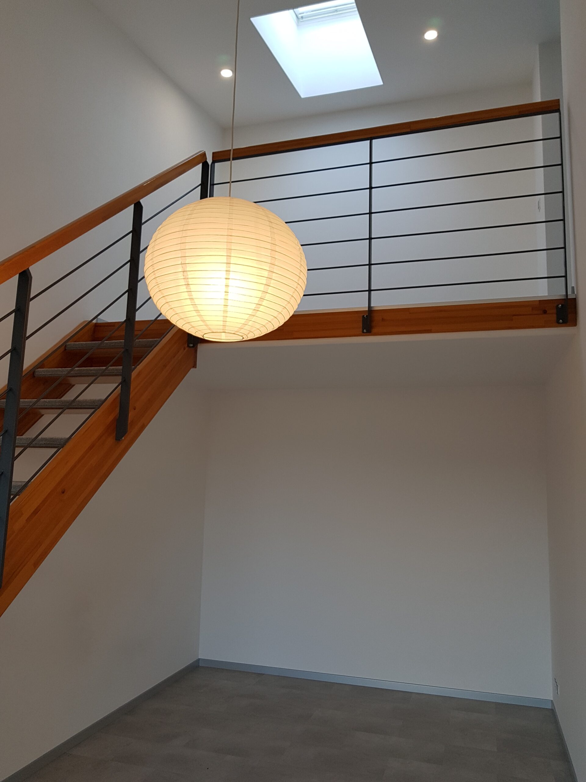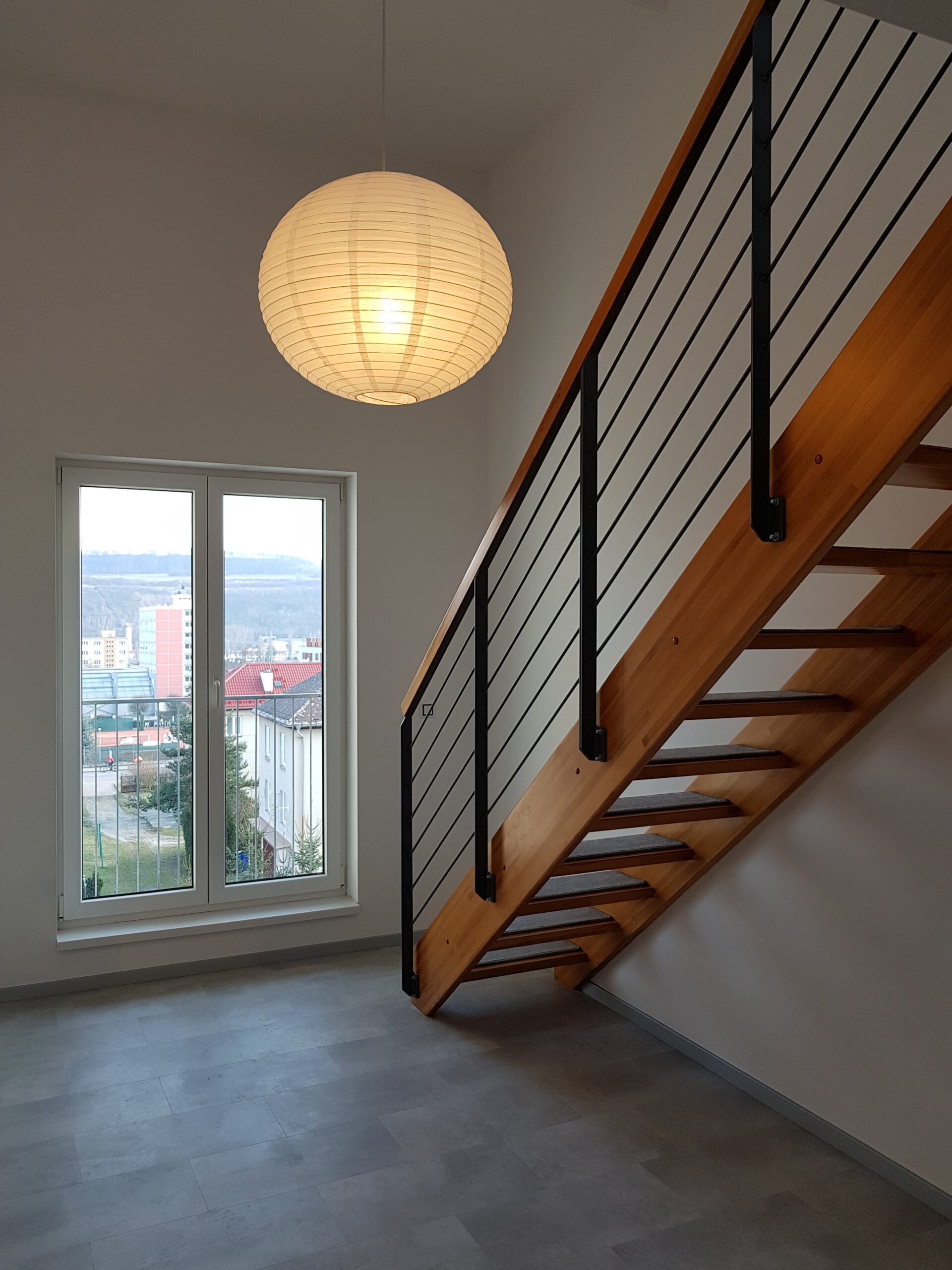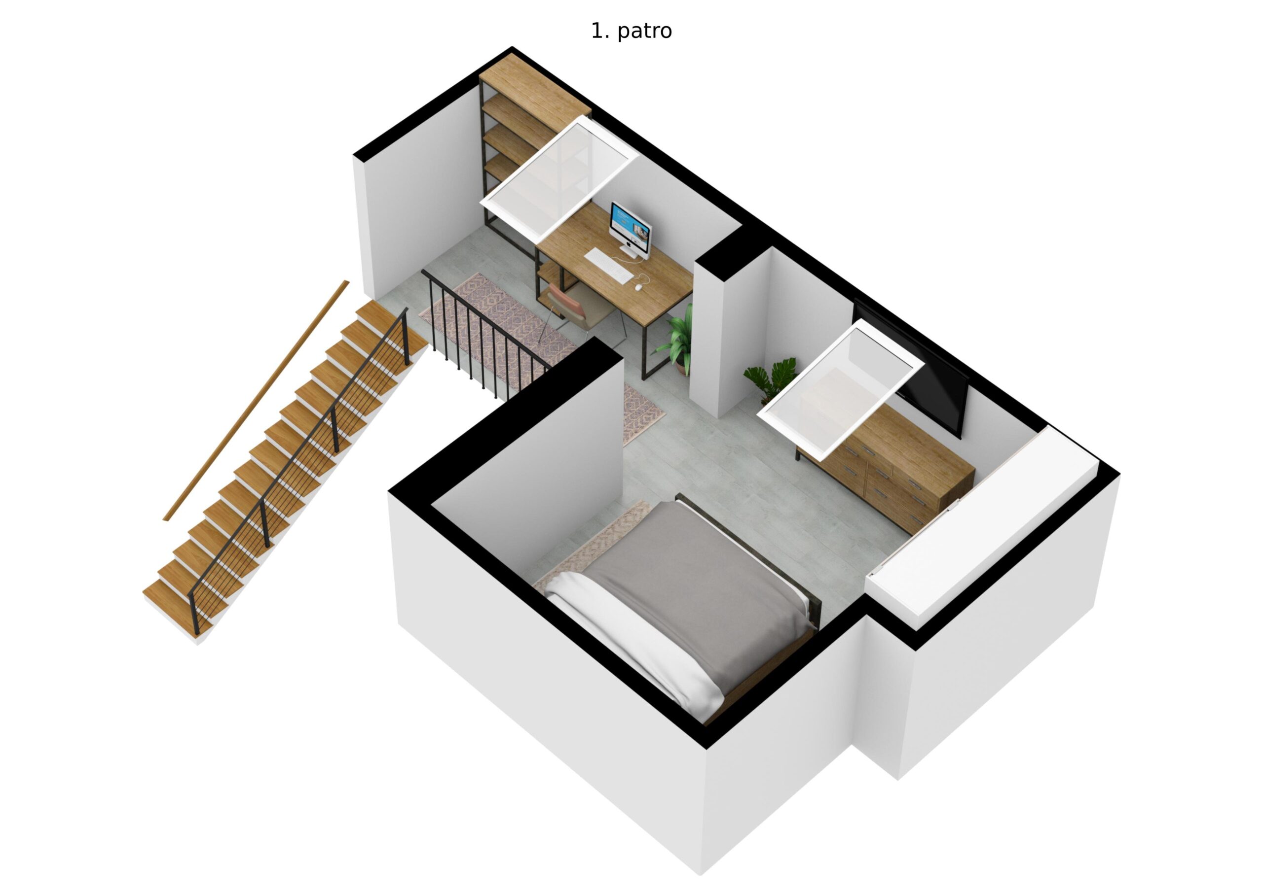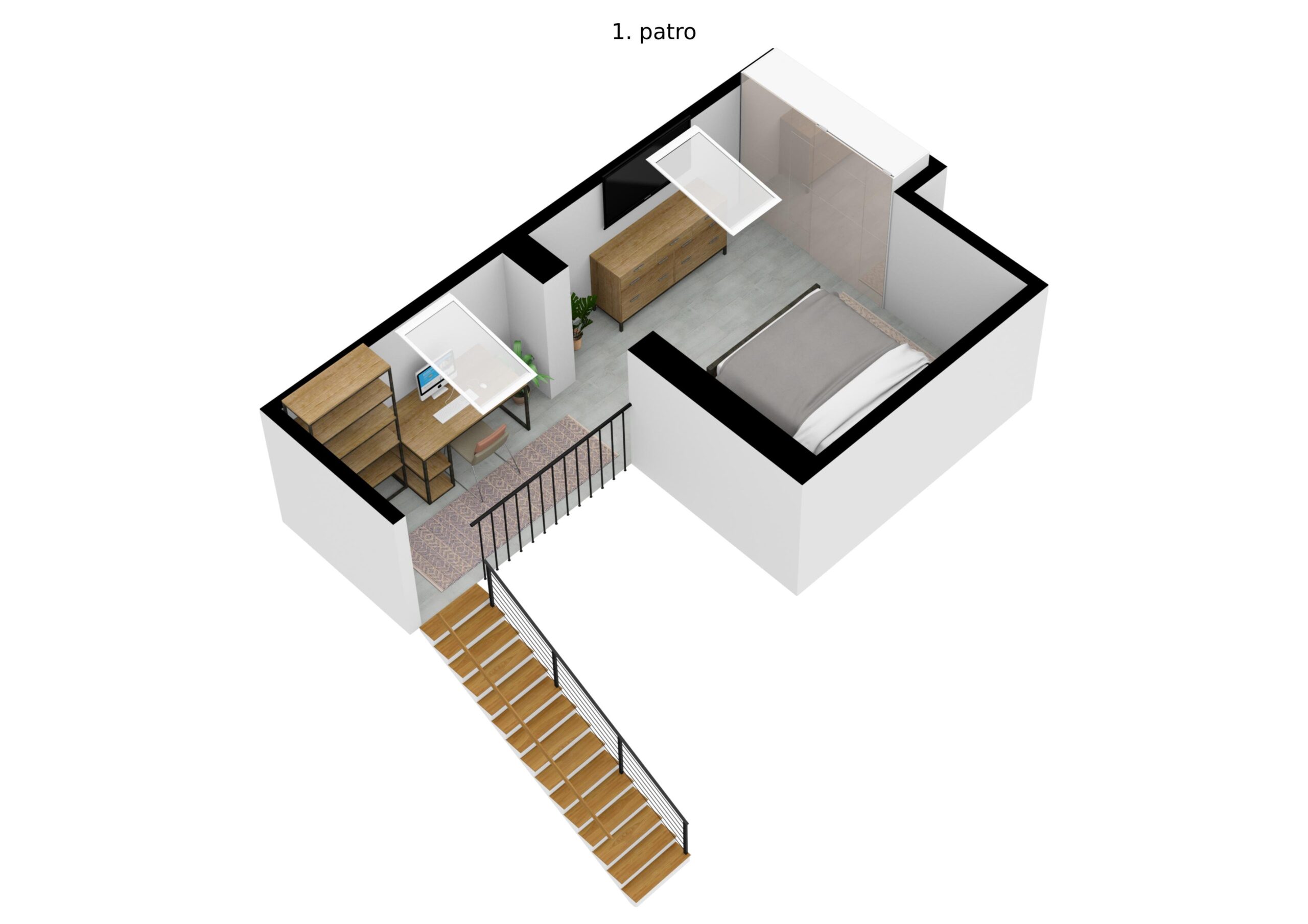 Byt disponuje obývacím pokojem propojeným dřevěným schodištěm s galerií a podkrovním pokojem se střešními okny ve zvýšeném patře.