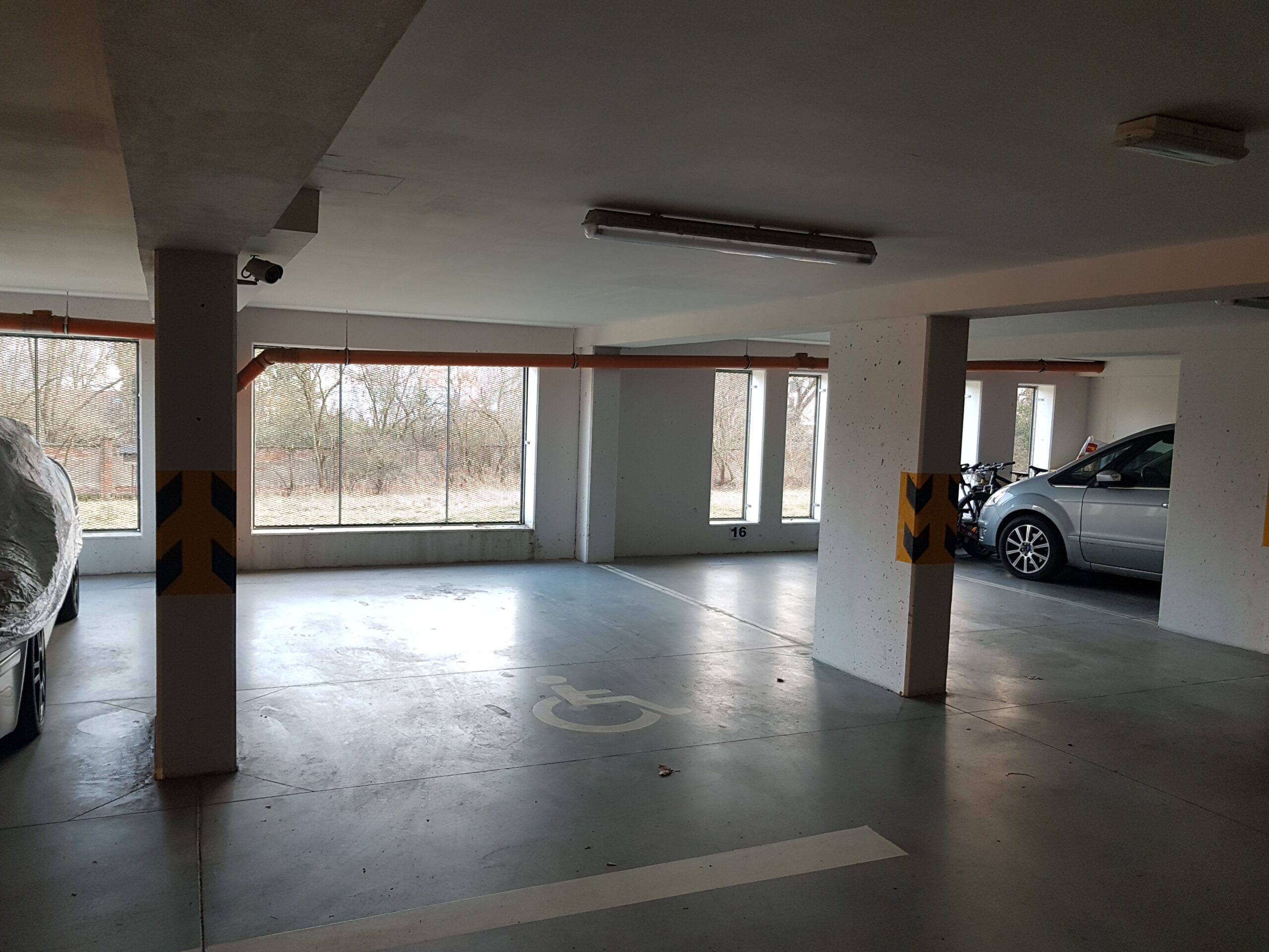 K bytu náleží vyhrazené garážové stání pro invalidy (17,5 m2) chráněné kamerovým systémem a také sklepní kóje v suterénu (2 m2).