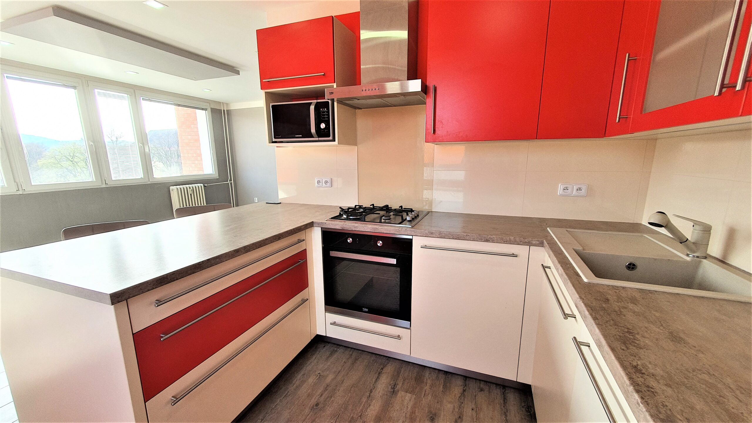 Moderní kuchyňská linka je kompletně vybavena veškerými spotřebiči (lednice s mrazákem, el. trouba s grilem a plynovým sporákem, digestoř, myčka, mikrovlnná trouba).