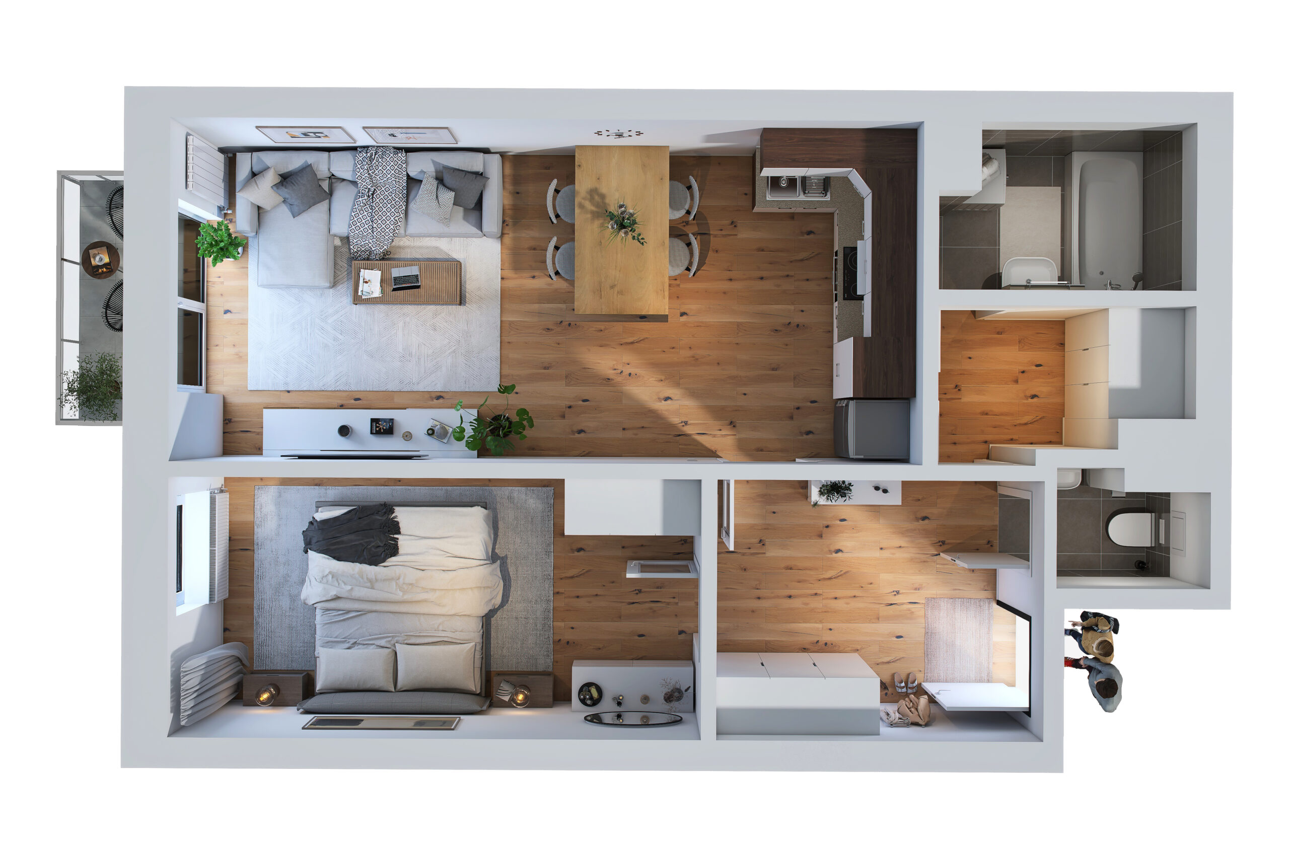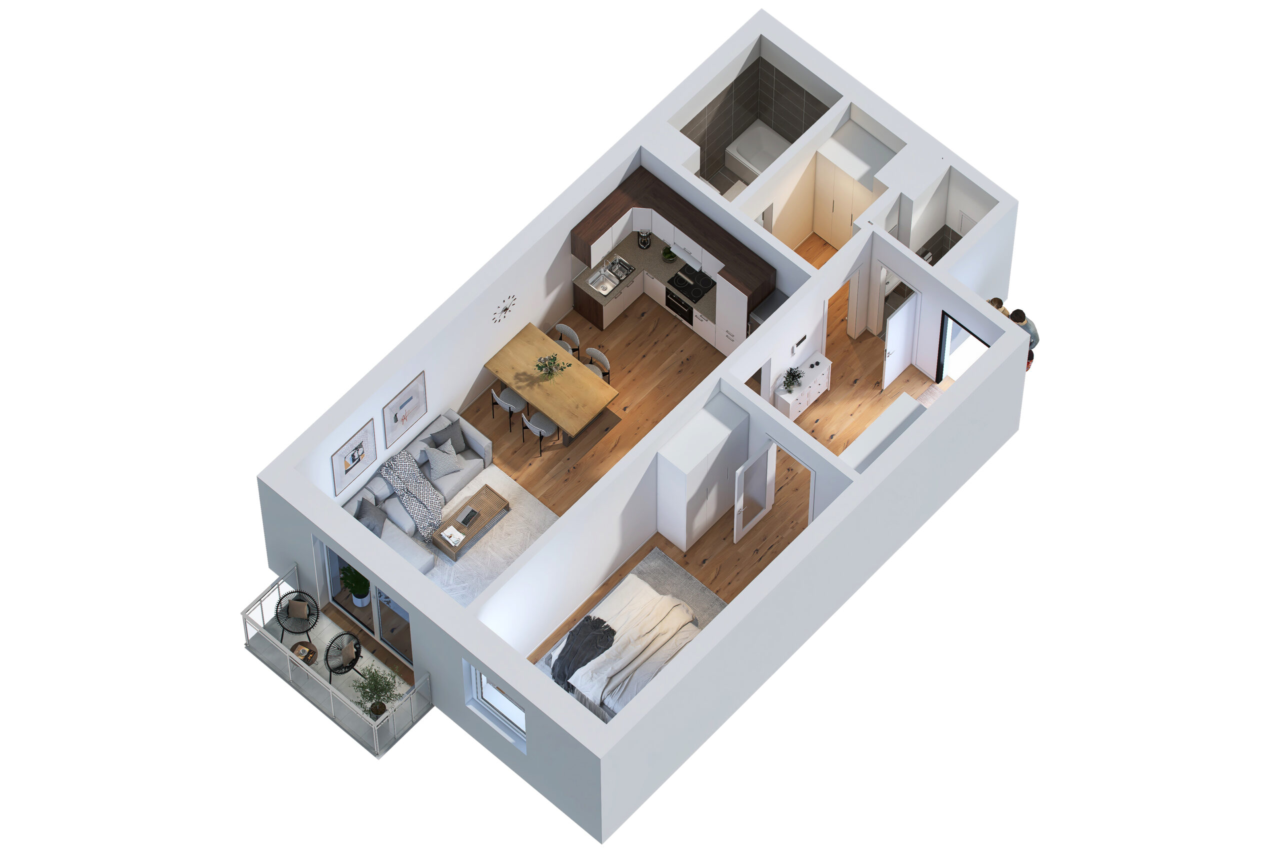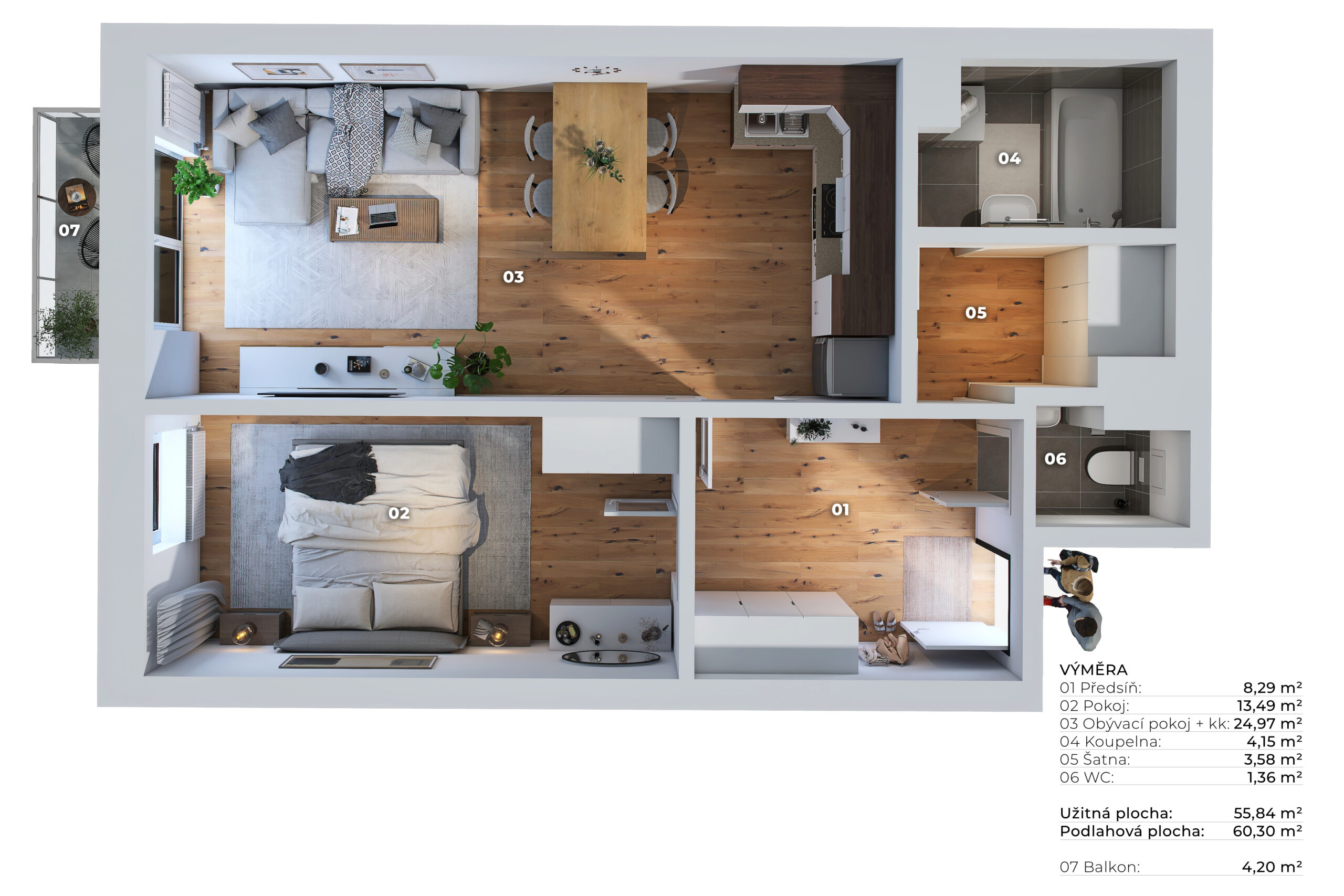 Byt tvoří dvě obytné místnosti s velkorysým obytným prostorem, velkou předsíní, praktickou šatnou a moderní koupelnou s oddělenou toaletou.