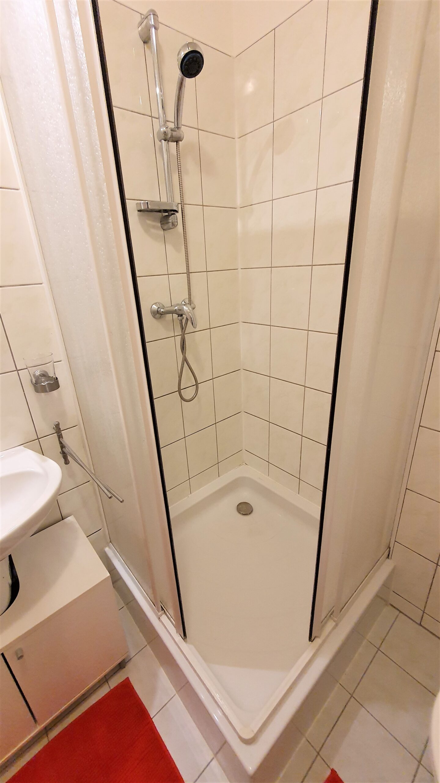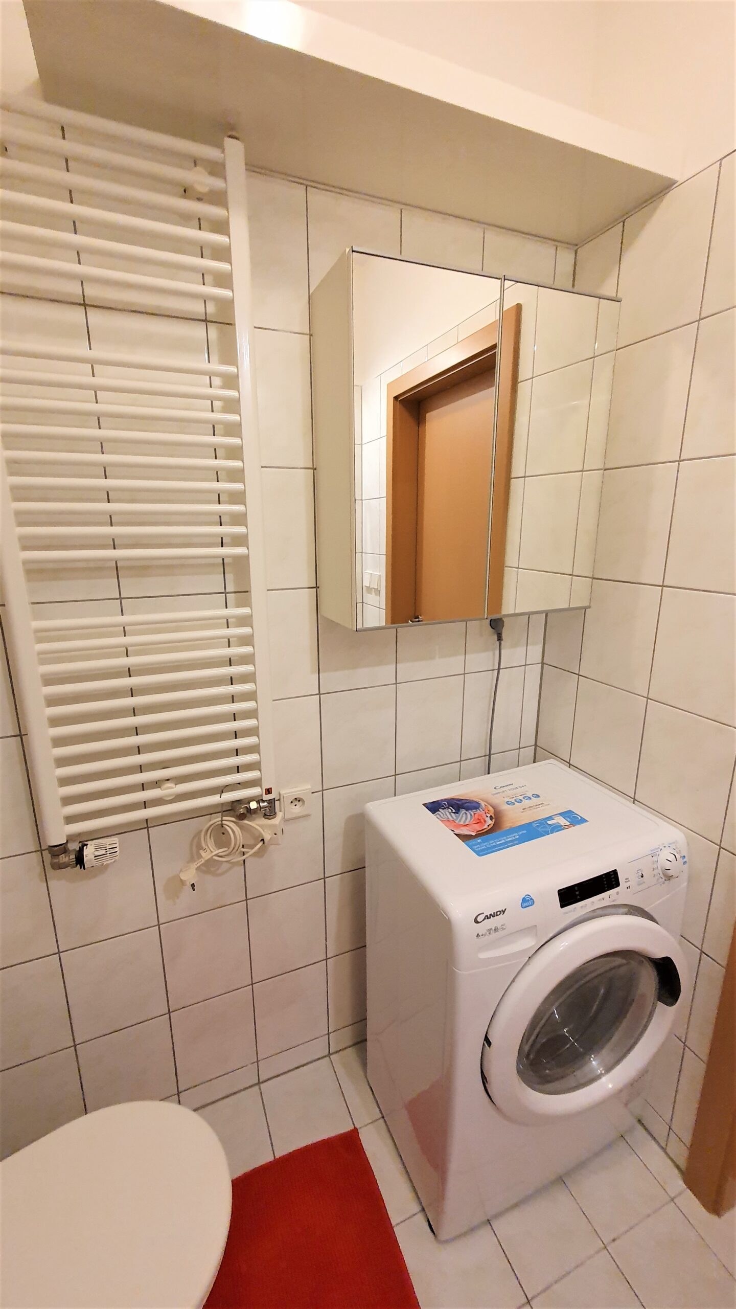 Prostorná koupelna je vybavena sprchovým koutem, toaletou a pračkou.