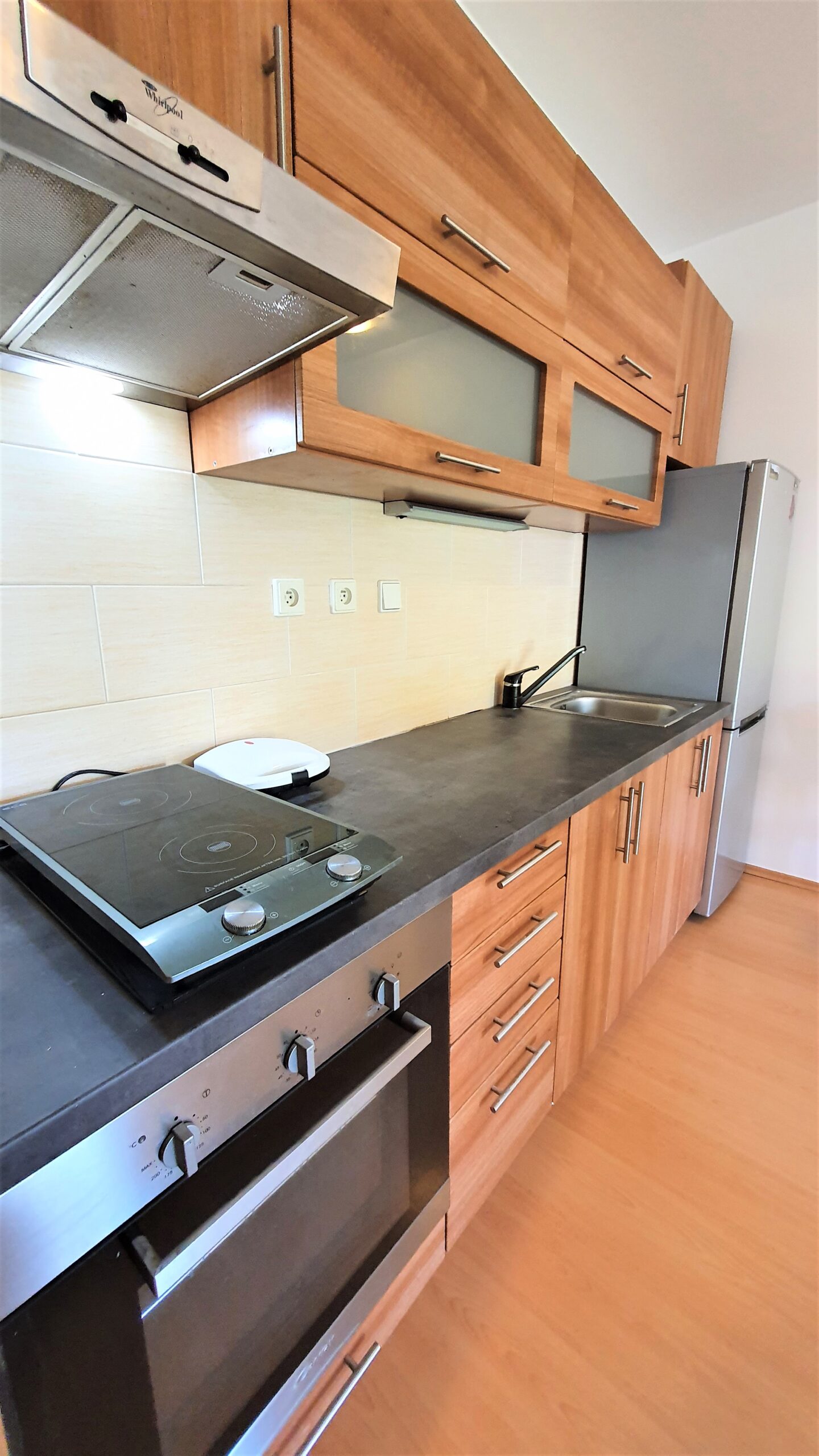 Moderní kuchyňská linka je vybavena el. troubou a se sporákem, digestoří, lednicí s mrazákem a toustovačem.