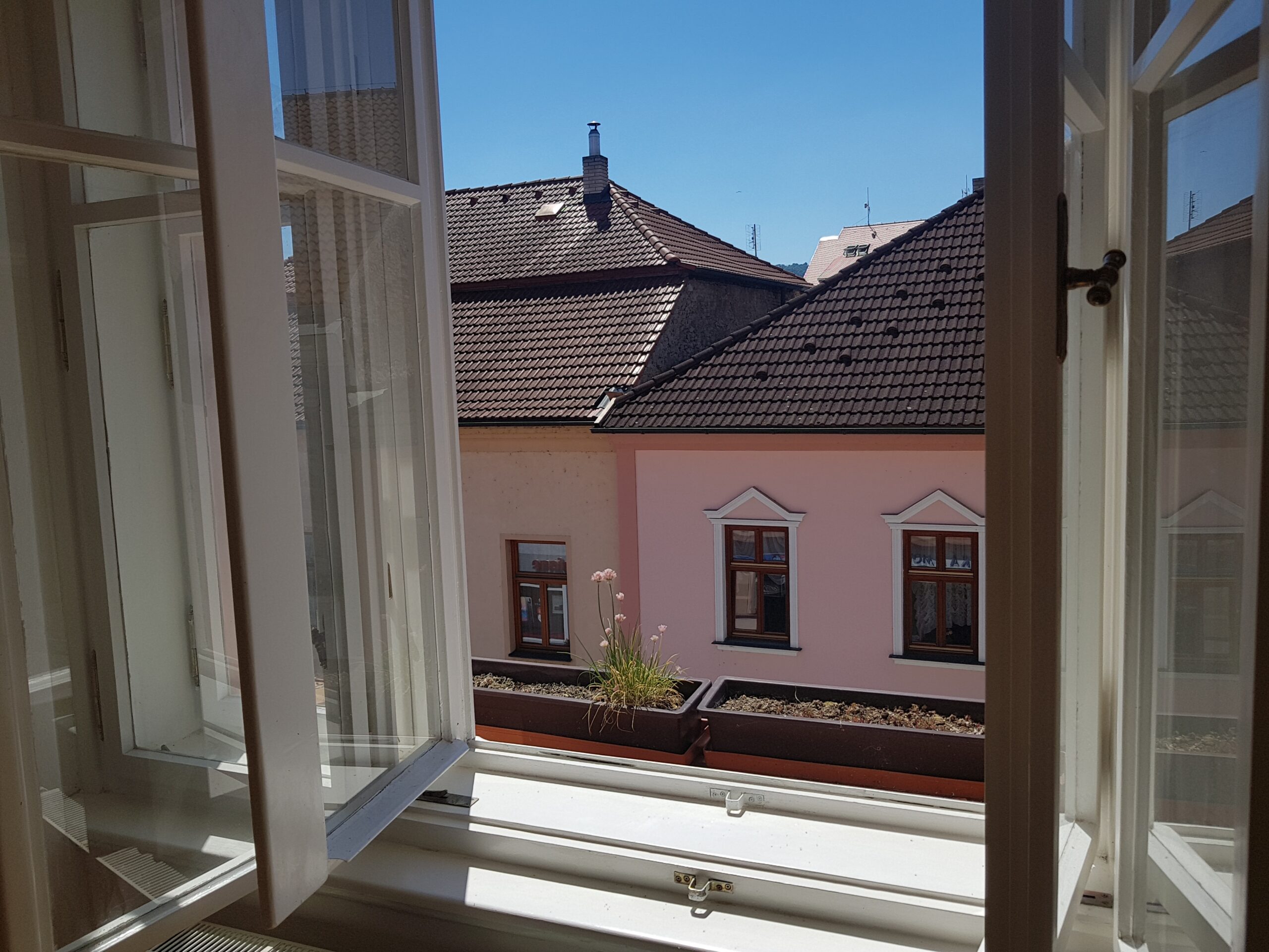 Interiér působí velice příjemným a vzdušným dojmem a zadní pokoj nabízí nevšední výhled na starobylou Plzeňskou bránu.
