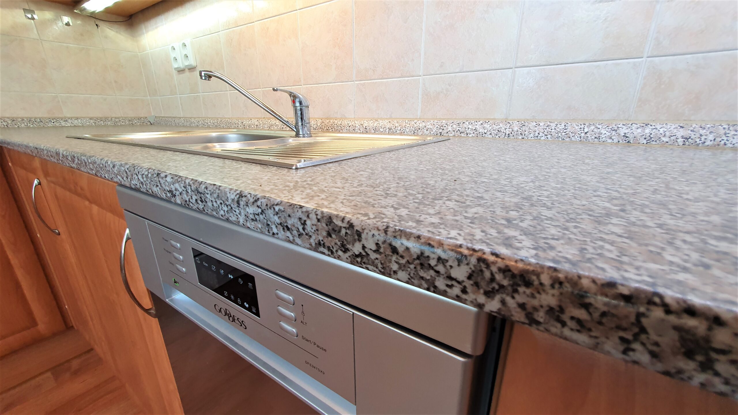 Moderní kuchyňský kout je vybaven elektrickou troubou s plynovým sporákem, myčkou a lednicí s mrazákem.