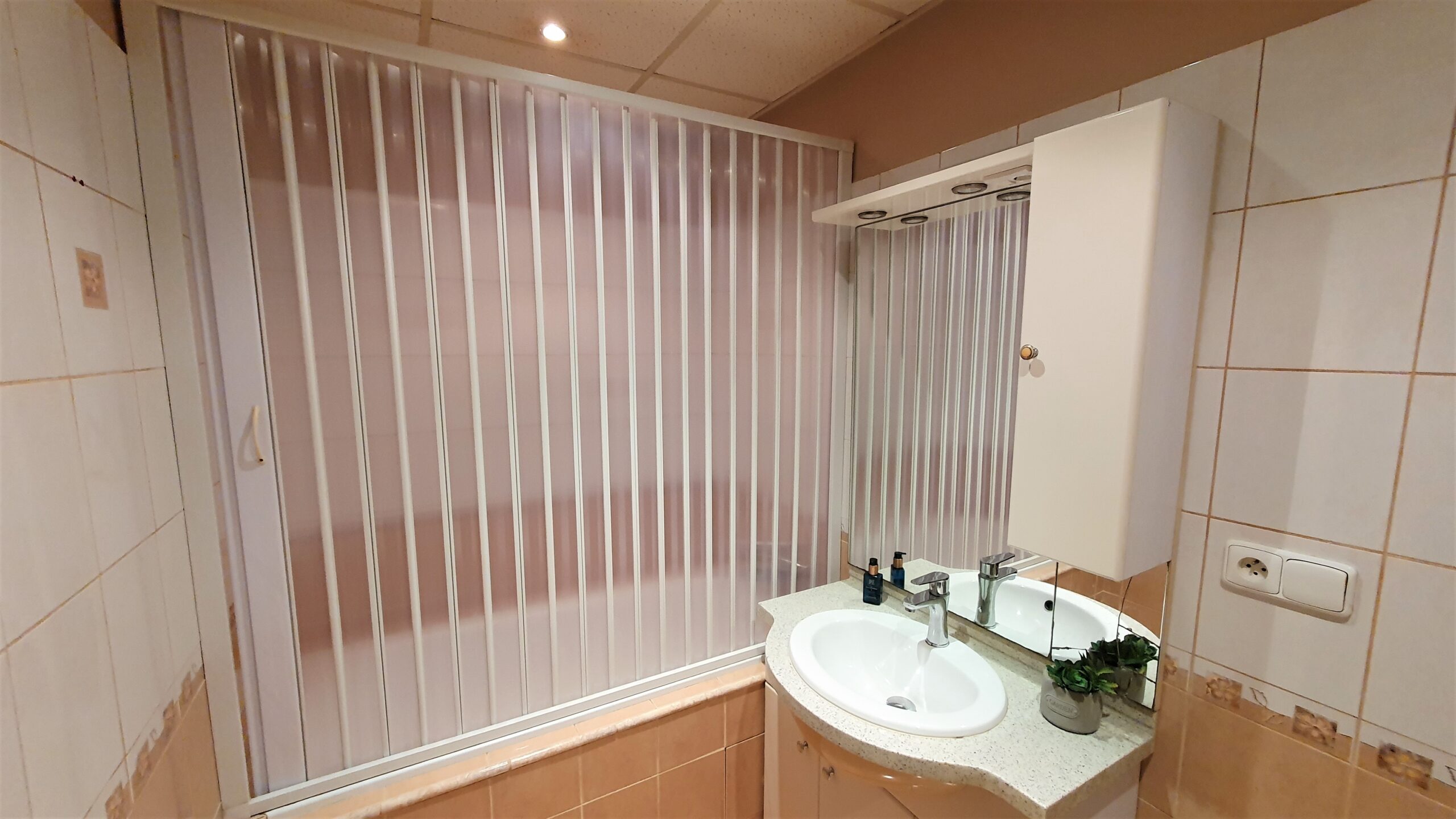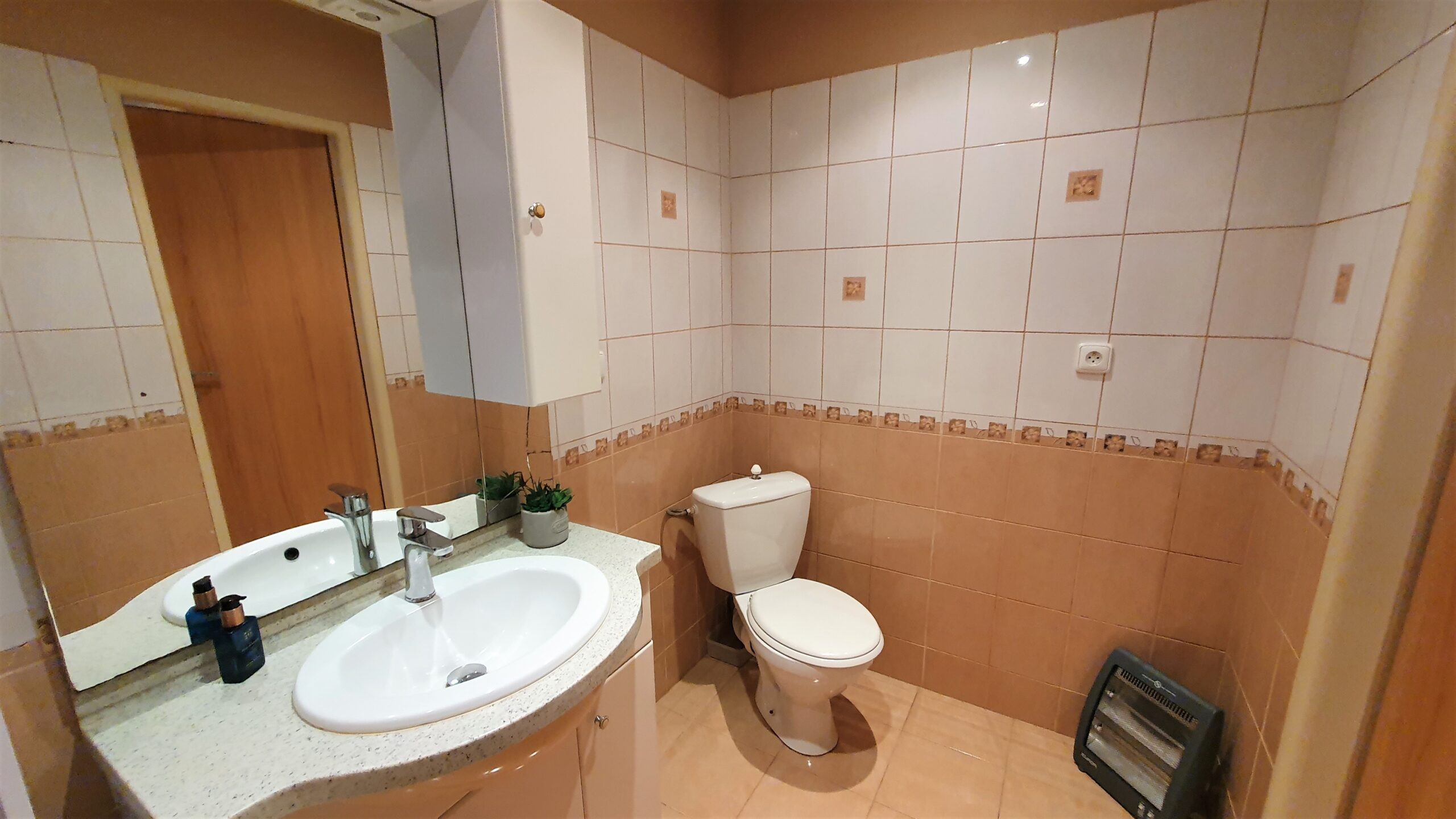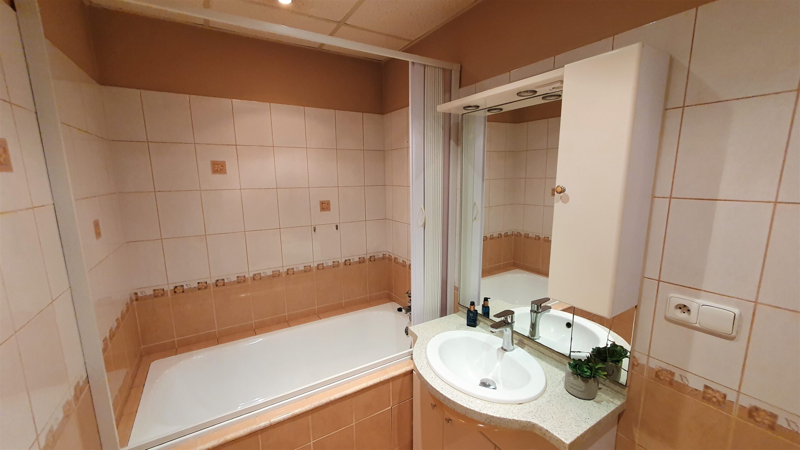 Prostoná koupelna s vanou včetně zástěny je propojena i s toaletou. Součástí vybavení je i pračka.