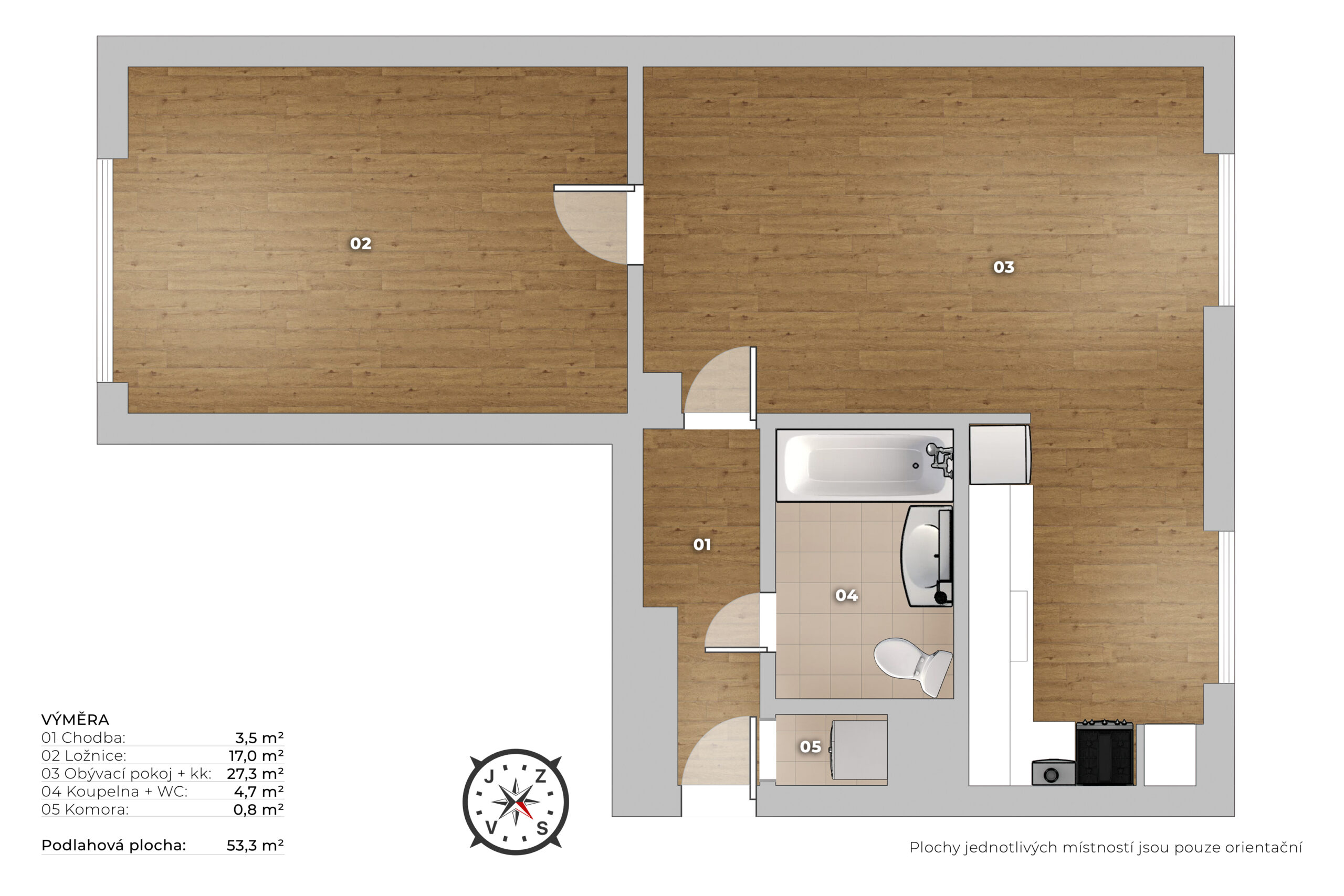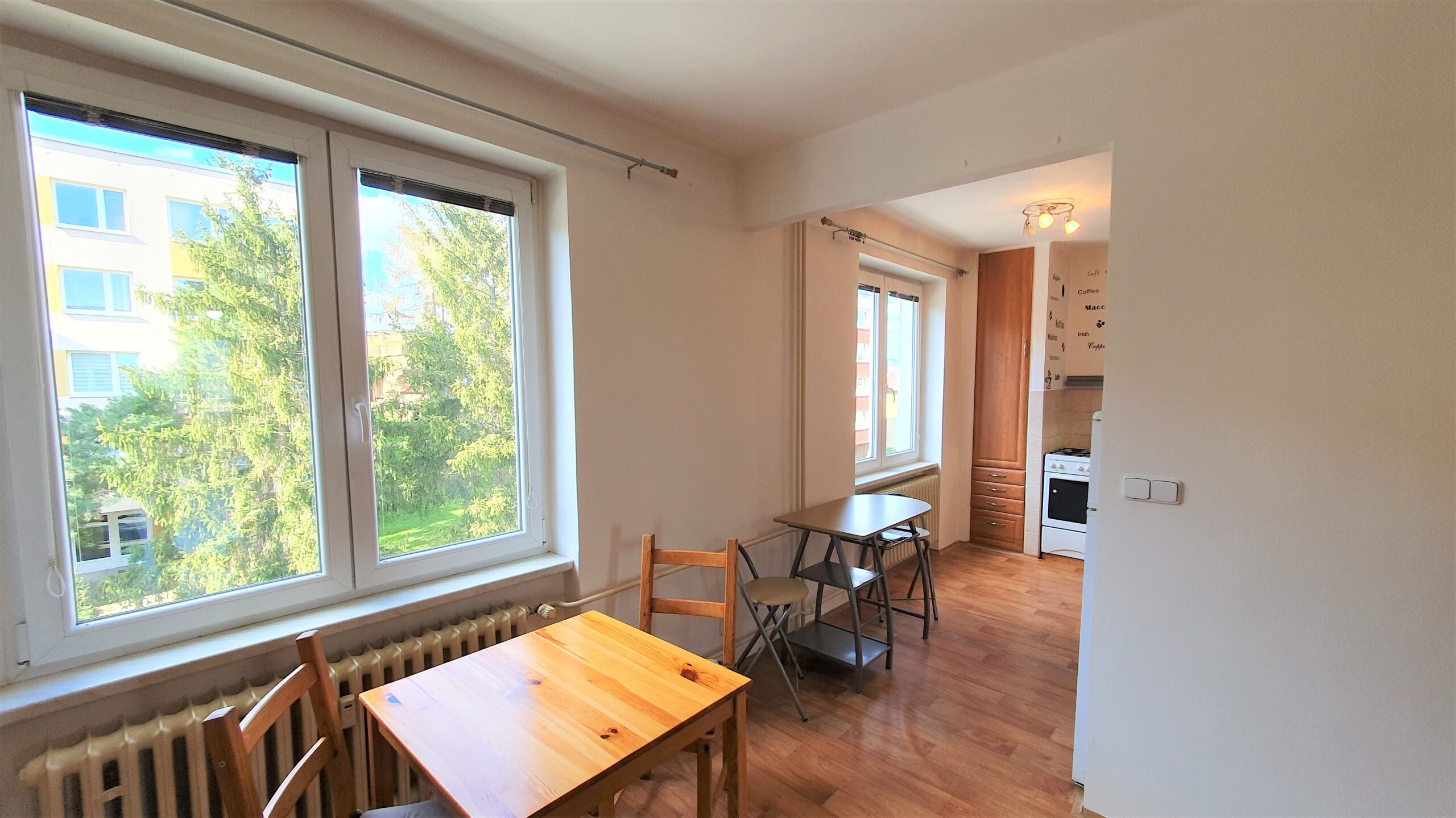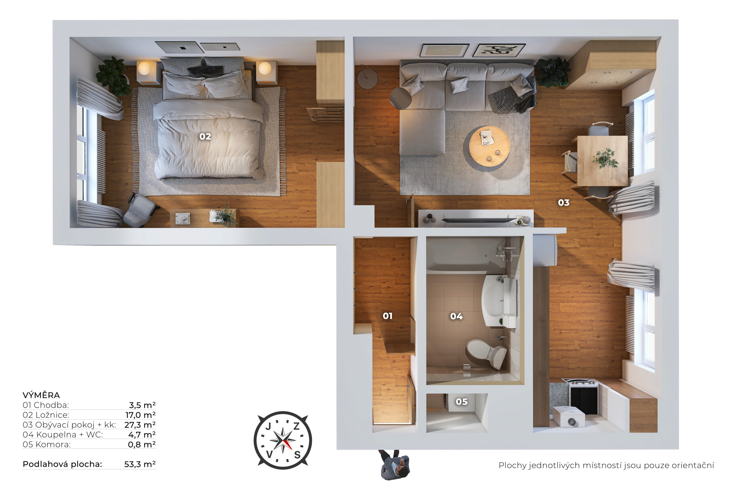 Byt tvoří dvě obytné místnosti částečně vybavené nábytkem a díky praktické orientaci na JV a SZ poskytují dostatek světla po celý den.