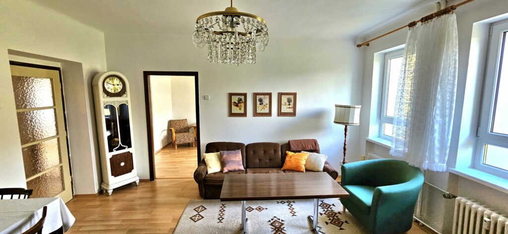 Byt tvoří celkem tři obytné místnosti částečně vybavené nábytkem s oddělenou kuchyní a díky praktické orientaci na SV a JZ nabízí dostatek světla po celý den.