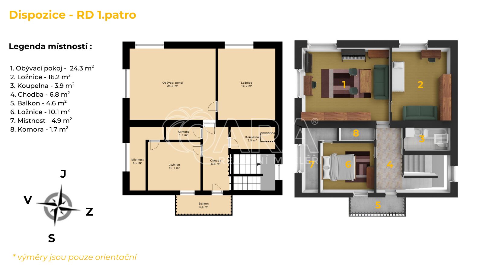 •. Podkroví (68 m²): 3 prostorné pokoje, koupelna/WC, komora + terasa s výhledem.