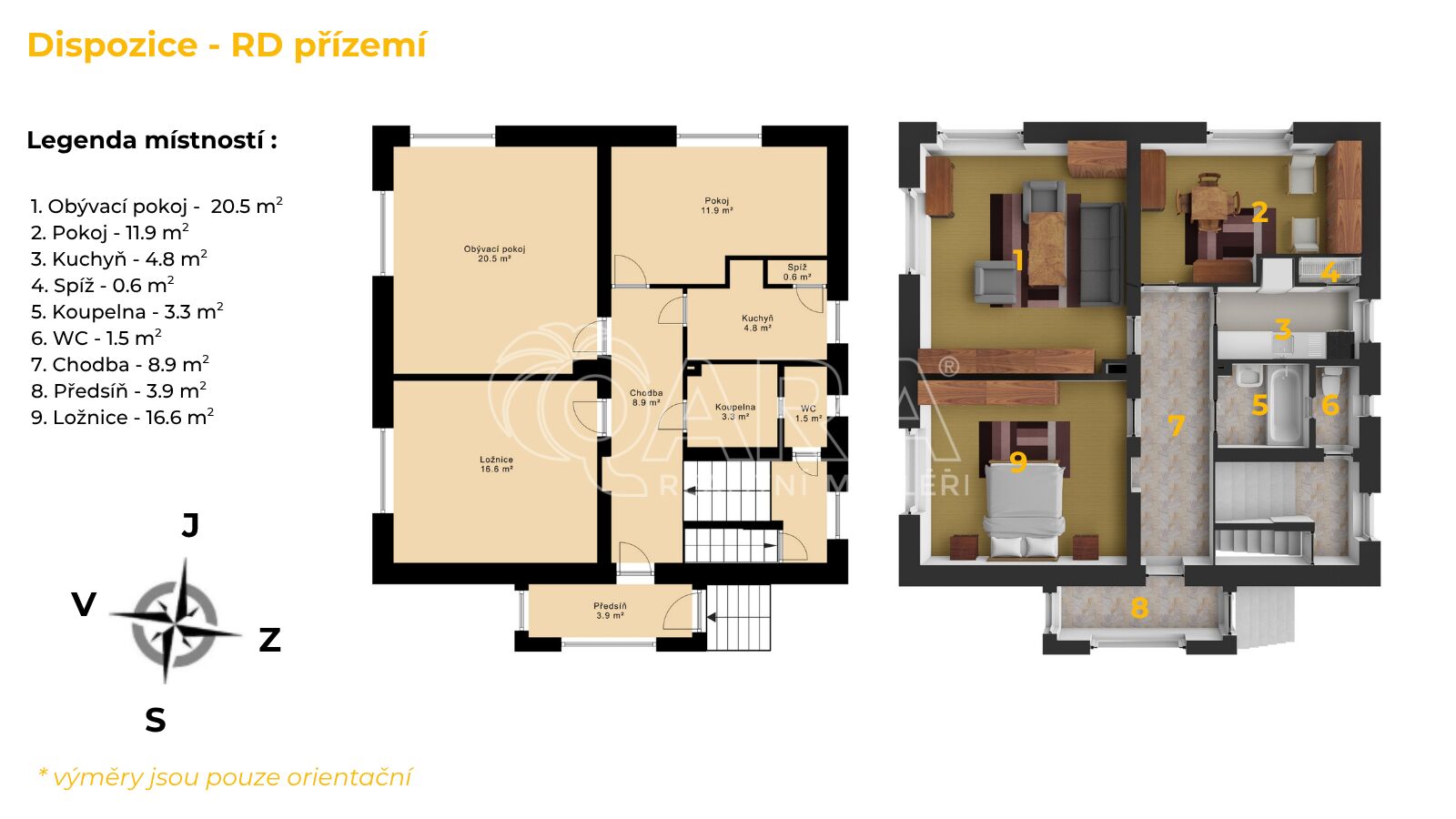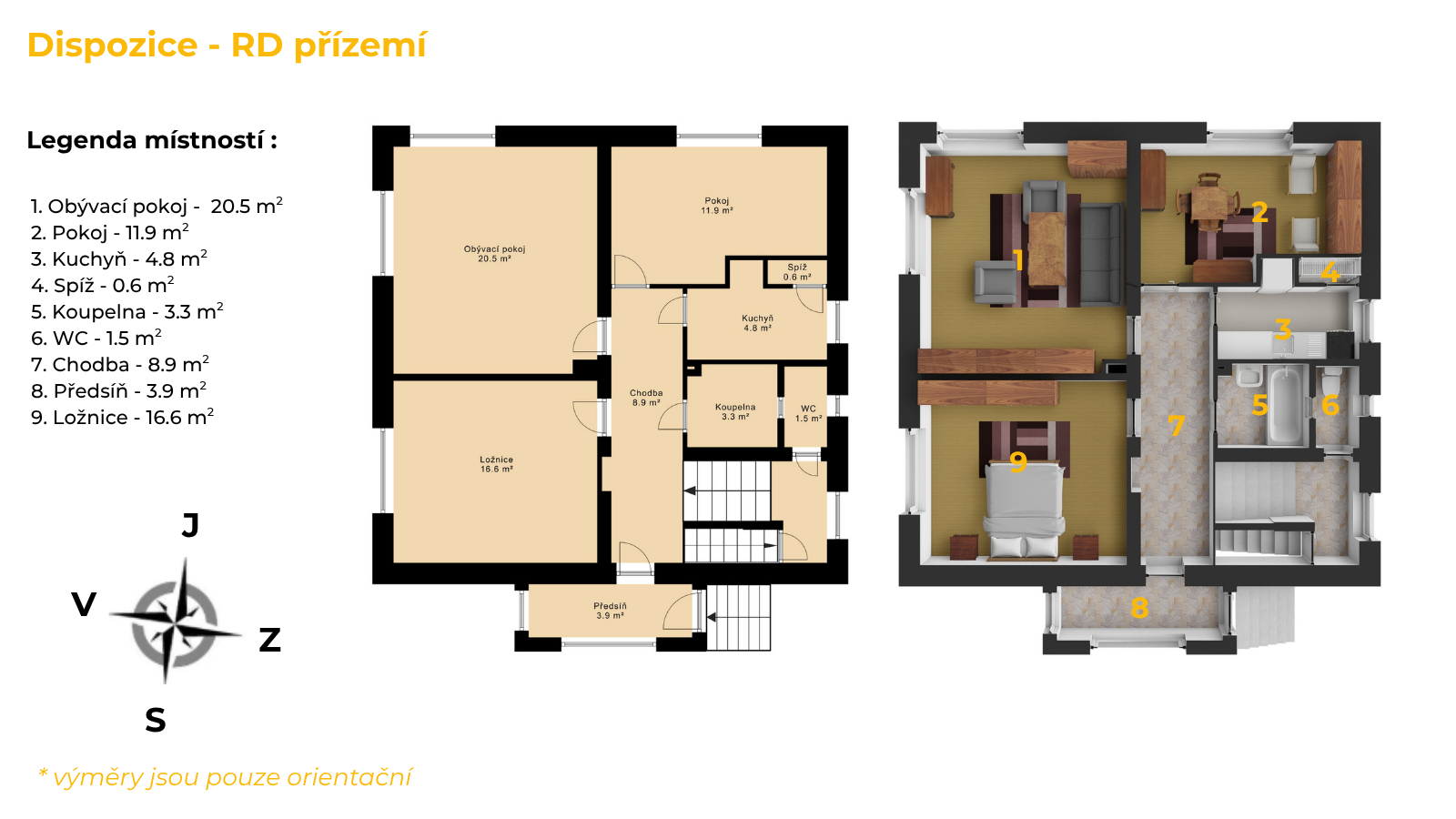 •. Přízemí (72 m²): předsíň, 3 slunné pokoje, kuchyně + spíž, koupelna/WC.