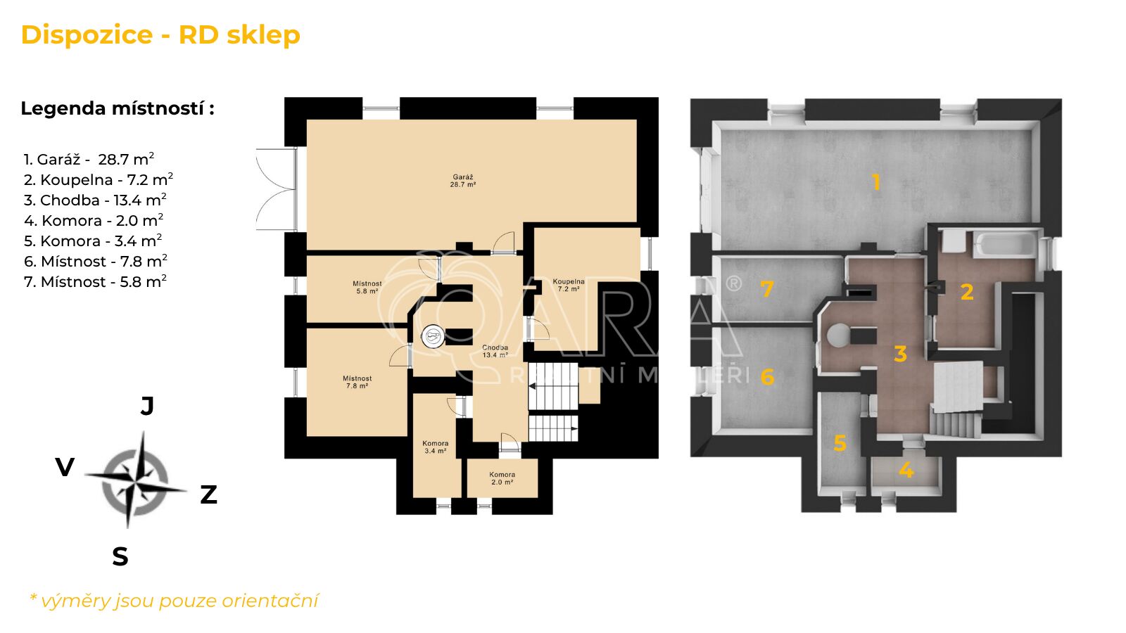 •. Suterén (68 m²): velká garáž + rozsáhlé sklepy s možností dílny, hobby místnosti či sklípku.