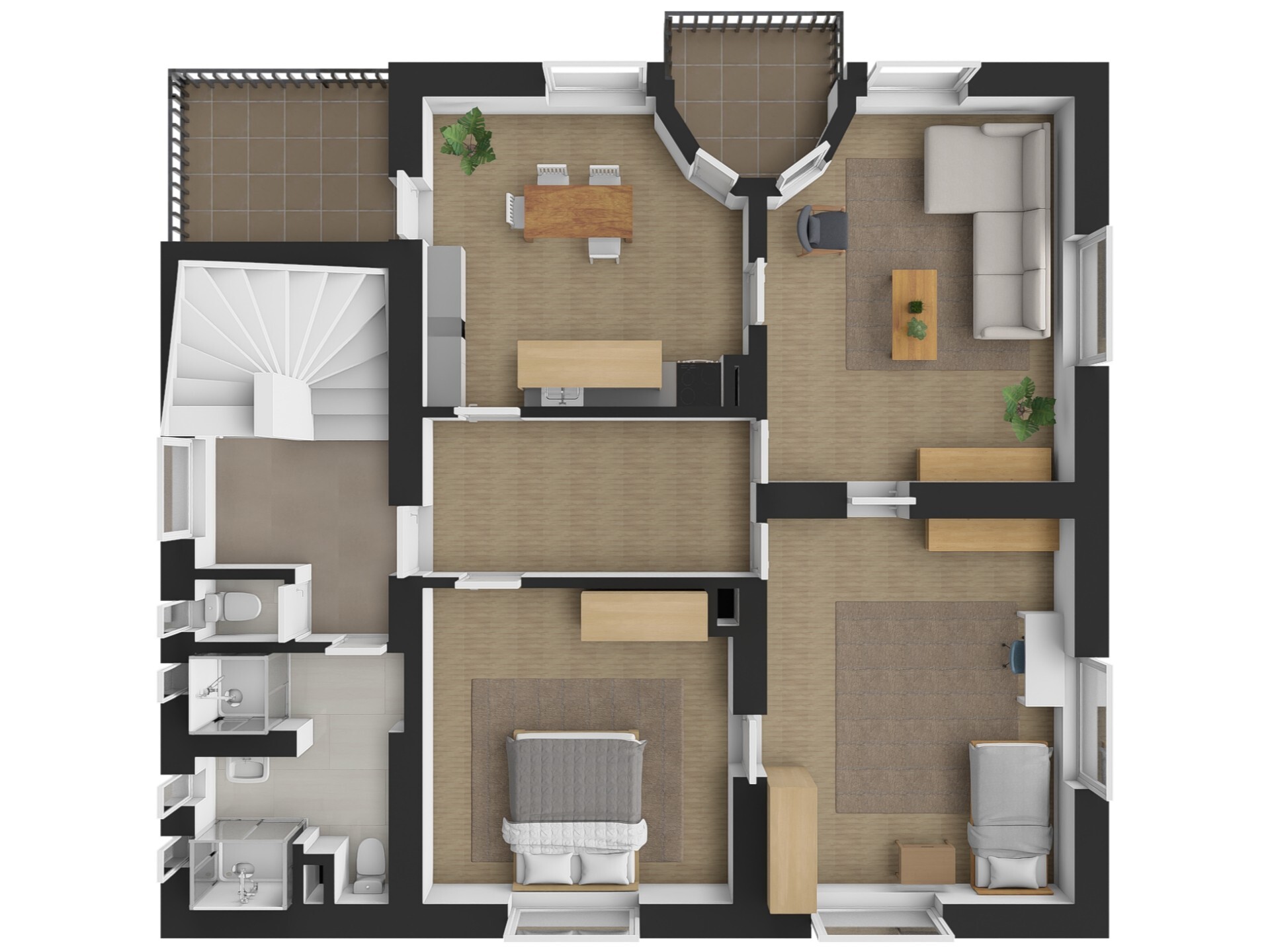 ✔ Druhý byt v přízemí: 91 m² + terasa 28 m²