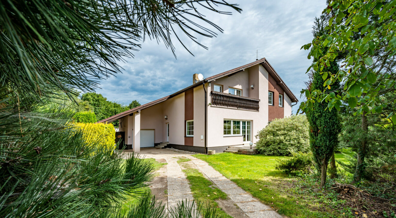 Dvoupodlažní vila z roku 1995 nabízí celkovou obytnou plochu 288 m2 pro dvě bytové jednotky o dispozici 5+1 a 3+1 s vlastními vchody a čtyřmi koupelnami na pozemku o velikosti 2082 m2.